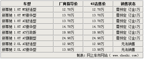 經(jīng)銷商透露,現(xiàn)在各店內(nèi)的新尊馳基本為展車或已被客戶預(yù)訂的車輛,基本沒有現(xiàn)車可以滿足消費者的需要,消費者如需購買可以繳納1萬元訂金后等待20天左右即可提車。由于新尊馳為剛剛上市的新車,所以沒有任何形式的優(yōu)惠。同時銷售人員還說明,2.0L的新尊馳由于尚未大量投產(chǎn),故暫時無法銷售,請消費者諒解。