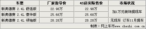 據(jù)北京地區(qū)廣州本田4S店銷(xiāo)售人員介紹,新款?yuàn)W德賽在上市之前訂單數(shù)量已經(jīng)非常火爆,上市之初各經(jīng)銷(xiāo)商只有展車(chē)和試駕車(chē)。目前訂單數(shù)量仍在增加,只有部分4S店有部分現(xiàn)車(chē)銷(xiāo)售,消費(fèi)者要提現(xiàn)車(chē)的話(huà)則必須要加裝1萬(wàn)元的裝飾。如果訂車(chē)的話(huà)需要繳納5000元-1萬(wàn)左右訂金,11月初才能提到車(chē)。