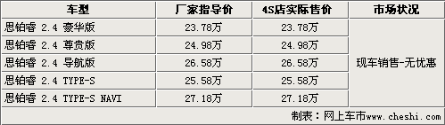 據(jù)東風本田4S店銷售人員介紹,目前思鉑睿全系車型均以到店,但車型顏色比較單一。思鉑睿全系提供了塔夫綢白、彩晶黑、鈦金銀、炫影藍、炫動紫五種外觀顏色,以及靜雅黃、靜逸黑兩種內飾顏色供消費者選擇。TYPE-S車型還推出炫速紅專用色。售后保養(yǎng)方面制定整車三年十萬公里的保修政策,提供3個月/5000公里的易損件保修服務。