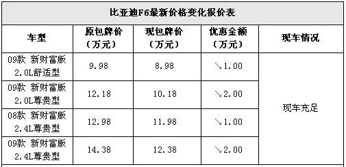 近日,編輯從深圳粵迪比亞迪4S店了解到,目前比亞迪F6現(xiàn)車比較充足,并且有1-2萬元的現(xiàn)金優(yōu)惠,該優(yōu)惠是在包牌價(jià)的基礎(chǔ)上實(shí)行,感興趣的朋友請致電咨詢。具體價(jià)格請見下表: