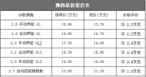 09款獅跑上市后,價(jià)格迅速下降,因此月銷量能夠穩(wěn)定在4000輛左右。我們昨日從北京地區(qū)一家東風(fēng)悅達(dá)起亞獅跑經(jīng)銷商處了解到,近期獅跑部分車型的優(yōu)惠再次增加2000元,最高降幅已經(jīng)增至2.4萬元,性價(jià)比再次提升。目前獅跑最低配車型2.0手動(dòng)兩驅(qū)舒適版的售價(jià)為13.78萬元,和歷史最低價(jià)持平,和競(jìng)爭(zhēng)對(duì)手途勝售價(jià)非常接近。以下是09款獅跑最新詳細(xì)報(bào)價(jià)表: