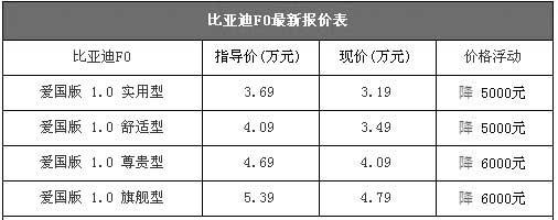 新奧拓16日上市之后熱銷,部分地區(qū)甚至出現(xiàn)了加價(jià)售車的情況,作為新奧拓最有直接的競爭對手,比亞迪F0近期的價(jià)格有沒有變化呢?昨日,我們從北京地區(qū)的部分綜合經(jīng)銷商處了解到,近期比亞迪F0最高可優(yōu)惠6000元,其最低配車型愛國版1.0手動(dòng)實(shí)用型的售價(jià)已經(jīng)降至3.19萬元,比QQ3 1.1L排量還要便宜,是國內(nèi)1.0L以上排量中最便宜的新車,性價(jià)比出眾。以下是比亞迪F0最新報(bào)價(jià)表: