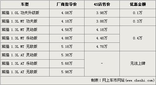 據(jù)吉利汽車4S店銷售人員介紹,吉利熊貓近期有最高4000元的優(yōu)惠。新推出的1.0L車型優(yōu)惠為1000元,售價(jià)降到了3.98萬(wàn)元。1.3L手動(dòng)功夫版優(yōu)惠3000元,售價(jià)降到了3.88萬(wàn)元,其他手動(dòng)擋車型優(yōu)惠4000元。由于熊貓1.3L自動(dòng)檔車型尾氣排放不合格,所以無(wú)法在北京上牌照。銷售人員還介紹,目前1.0L車型較緊張,1.3L車型現(xiàn)車充足。