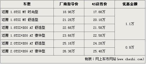 據(jù)北京一汽大眾經(jīng)銷店銷售人員介紹,邁騰全系車型全系優(yōu)惠1.1萬(wàn)元。經(jīng)1.1萬(wàn)元的優(yōu)惠后,全系入門(mén)級(jí)的1.8TSI MT時(shí)尚型的售價(jià)從18.98萬(wàn)元下降到了17.88萬(wàn)元。全系最高配的邁騰2.0TSI豪華版經(jīng)9000元優(yōu)惠后,售價(jià)降到了25.48萬(wàn)元。銷售人員還介紹,目前邁騰全系現(xiàn)車都比較充足。