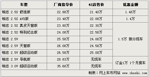 目前銳志的在價格優惠方面基本和11月保持一致,其中入門級舒適版優惠1.48萬,最低售價為21.40萬,2.5真皮版以及天窗版等優惠1.5萬元,部分店內還推出了贈送保險等相應活動。而3.0排量一直沒有現車供應,還需要訂車。銳志全系車型較多,一般購買車型主要集中在舒適版和紀念版,消費者可根據需要選購。