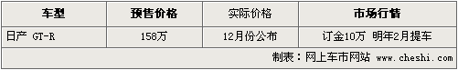 據東風日產4S店銷售人員介紹,預計日產GT-R實際價格將在12月份公布,目前已接受該車預訂,預售價格在158萬元,現在消費者預訂的話需要訂金10萬元。另據了解,根據車型顏色的不同,訂車速度有所不同,白顏色車型最快明年2月可以提車,而黑色車型需要多等待1個月時間。