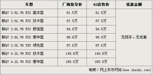據北京奧迪4S店銷售人員介紹,奧迪新Q7共有3種排量7款車型,售價區間為81.5至165萬元。目前店內全系均無現車,欲購買的消費者需交定金5萬元,最早明年3月初可提到現車。