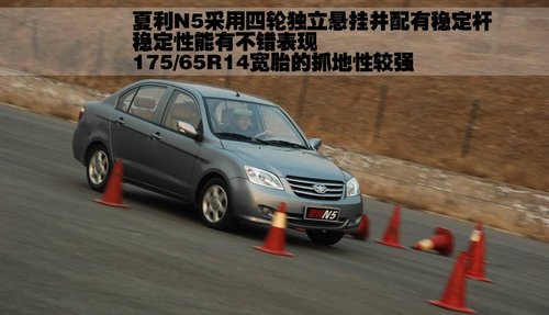 這項測試也可稱之為“麋鹿測試”,可以檢驗車輛回避障礙的能力。對于我們進(jìn)行測試的車輛來說,60km/h的通過速度基本已經(jīng)達(dá)到極限。夏利N5采用四輪獨立懸掛,能夠提供有效的后段支撐力,并且配備了穩(wěn)定桿,能夠使車輛保持在穩(wěn)定的行駛路線。另外,夏利N5配備175/65R14的寬胎,緊急并線時表現(xiàn)的抓地力也非常不錯。
