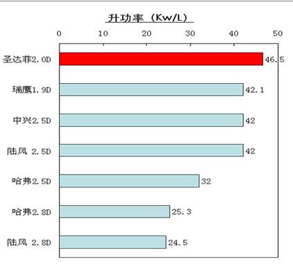 升功率看起來是一項枯燥的數據,但對于實際用車來說意義非凡。這意味著“通過較小的排量獲得較大的動力性能。”所以它的實際動力性甚至比那些絕對功率比它大的車型都要強勁。雖然哈佛和陸風、中興等都是2.5、2.8排量的“大家伙”,但很多人駕駛華泰圣達菲2.0T的感覺勁道更足,就是源于這個道理。