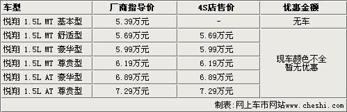 據長安汽車4S店銷售人員介紹,悅翔目前只有五款車型有現車銷售,其中包括三款手動檔車型和兩款自動檔車型。售價5.39萬元的悅翔手動基本型一直就沒有現車銷售,屬于有價無車的狀態。其他車型雖然有現車,但個別顏色仍需要預訂。長安汽車4S店銷售人員表示,目前購買悅翔并沒有任何優惠政策。