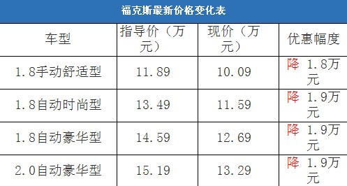 近日,編輯從北京地區長安福特4S經銷商處了解到,福克斯的現車充足,顏色也比較全,但是目前購車沒有任何優惠,只能消費者到店與銷售人員詳談才可以爭取少量優惠。相比之下,福克斯在綜合經銷商處的優惠最高達到了1.9萬元,性價比非常不錯。以下是福克斯三廂最新價格變化表: