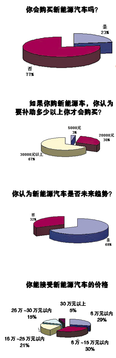 就新能源汽車目前的現(xiàn)狀,記者向近100位讀者做了調(diào)查,很多消費(fèi)者在接受調(diào)查時(shí)表示,新能源車的技術(shù)還不成熟,但是目前的新能源車價(jià)格卻很高,對(duì)于普通的消費(fèi)者來(lái)說(shuō),還不如買一部普通的用油小車。