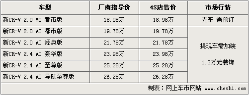 3月5日東風本田正式推出全新的CR-V,分為2.0L及2.4L兩種排量,共計六款車型,售價18.98萬元-26.28萬元,比老款增加了導航版車型,新CR-V在配置方面更加完善。根據網上車市價格監測系統顯示,全新上市的CR-V目前加價數額與3月基本相同,提現車需加裝1.3萬元裝飾。具體車型售價見下表: