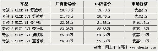 東風(fēng)日產(chǎn)旗下的SUV車型——奇駿,在上市之后憑借硬朗的外形和出色的動(dòng)力性能贏得了廣大消費(fèi)者的關(guān)注。尤其在全程支持南極科考的旅程中,奇駿經(jīng)受了惡略環(huán)境的考驗(yàn),給消費(fèi)者留下了深刻的印象。近日根據(jù)網(wǎng)上車市價(jià)格監(jiān)測(cè)顯示,目前購(gòu)買2010款奇駿最高可以享受到1.3萬(wàn)元的現(xiàn)金優(yōu)惠,但2.0排量車型現(xiàn)車比較緊張,部分車型和顏色需預(yù)訂。具體車型售價(jià)見下表: