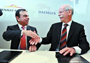 2010年4月7日,比利時(shí)布魯塞爾,當(dāng)戴姆勒集團(tuán)董事會(huì)主席迪特·蔡澈與雷諾-日產(chǎn)聯(lián)盟主席卡洛斯·戈恩同時(shí)在一份看起來非常簡(jiǎn)樸的文件上簽字之后,世界汽車工業(yè)的格局再次發(fā)生了重大改變,戴姆勒-雷諾-日產(chǎn)新組成的聯(lián)盟,一躍成為排在豐田和大眾-鈴木聯(lián)盟之后的世界第三大汽車聯(lián)盟。
