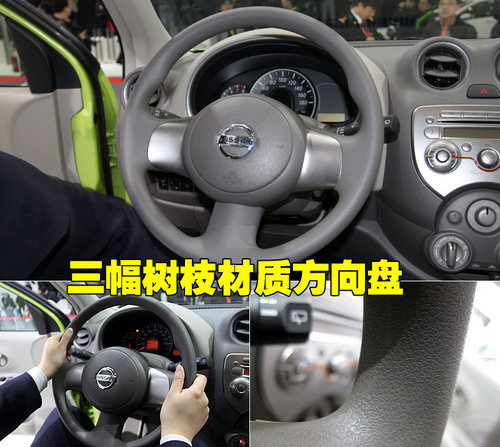 東風日產瑪馳采用了三幅式方向盤,配以銀色的裝飾面板,整體感覺運動時尚。這款方向盤的包覆材料為樹脂材質,質地較軟手握感覺比較舒適。局部做工方面,瑪馳方向盤的處理也比較精細,沒有毛邊等瑕疵。