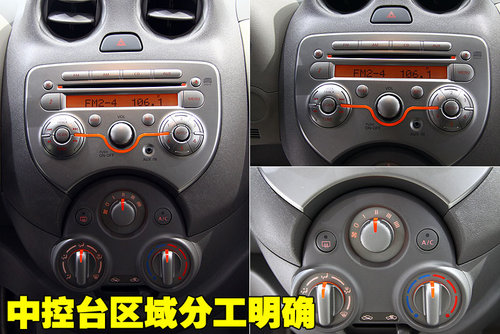 空調面板部分,東風日產瑪馳的控制區域分工明確,操作比較簡單,非常容易上手。控制區域分工明確,操作比較簡單,而且時尚氣息很濃。