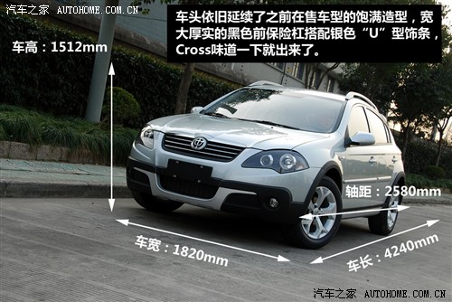 駿捷Cross的車身尺寸為4240mm×1820mm×1512mm,軸距依然為2580mm,與原型車駿捷FRV相比,除了底盤升高了20mm之外,中華駿捷Cross加裝了前后大包圍,標配的全鋁制車頂行李架和蜂窩狀的進氣格柵增加了動感和活力,輪轂由FRV的15寸升級為16寸的鋁合金輪轂,在增強視覺效果的同時,也使檔次得到一定提高。