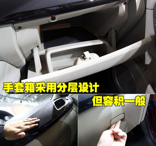 雷諾新風景的手套箱有阻尼設計,在打開手套箱后不會依靠重力原因而自由下落。另外新風景的手套箱內部空間設計得很大,在日常使用時能夠存放不少東西。不過這款車的手套箱內部沒有植絨設計,在行駛時小件物品可能會出現滑動。