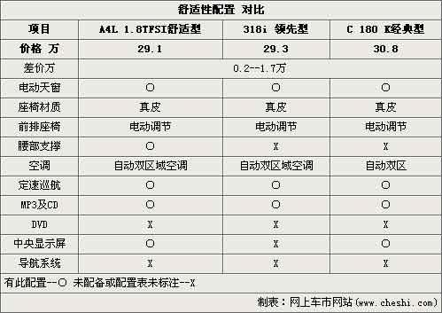 為了讓駕駛變得更輕松讓旅程變得更愜意,高端轎車一般都會具備較為全面的舒適娛樂設施。這三款車型基本上都是車系的入門產品,因此在配置上豪華型有所欠佳,實用性上也全部沒有配備GPS導航系統和DVD播放功能。不過3款車型均把一觸式防夾車窗、4門一觸式車窗、CD機作為了標準配備,進一步豐富了整車的功能性和娛樂性。其中奧迪A4L還提供了中央顯示屏以及雙區域的自動恒溫空調,應該說是更為細致入微的。