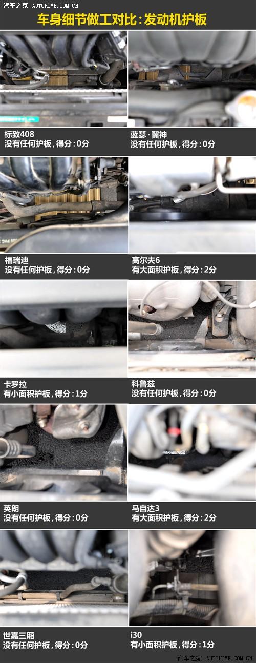 在發(fā)動(dòng)機(jī)護(hù)板這方面,高爾夫6和進(jìn)口馬自達(dá)兩廂有大面積的發(fā)動(dòng)機(jī)護(hù)板,能夠起到一定的保護(hù)作用,i30和卡羅拉有小面積的護(hù)板,而其他6款車型則沒(méi)有任何護(hù)板。