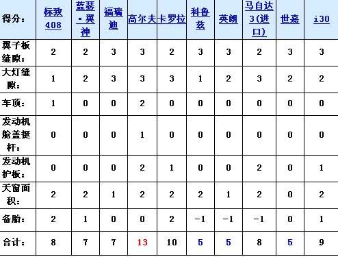 不難看出,標(biāo)致408雖然夠大,但他的做工和細(xì)節(jié)并不像看上去那么精細(xì),在10款緊湊型車中僅僅處于中等水平;藍(lán)瑟·翼神各方面中規(guī)中矩,沒有突出的亮點(diǎn);福瑞迪的外觀縫隙控制最出色,但天窗面積和備胎令人不爽;身材最小的高爾夫6因?yàn)榫哂芯?xì)的外部做工,大面積的天窗和發(fā)動(dòng)機(jī)護(hù)板而在外觀方面有一定的優(yōu)勢(shì),同時(shí)他的外觀也是十分招人待見的,只不過不停的減配令人很不爽;卡羅拉中庸但沒有明顯的短板,所以得分也不低;來(lái)自于通用集團(tuán)的科魯茲和英朗存在同樣的問題:大燈縫隙有點(diǎn)大,小備胎令人很很懊惱;進(jìn)口馬自達(dá)3如果不是因?yàn)樾涮サ脑挘敲闯煽?jī)也不錯(cuò);世嘉除了縫隙控制得還可以以外,其他方面沒有任何亮點(diǎn);i30的表現(xiàn)卻比想象中強(qiáng)大,各方面均衡,成績(jī)僅次于卡羅拉。