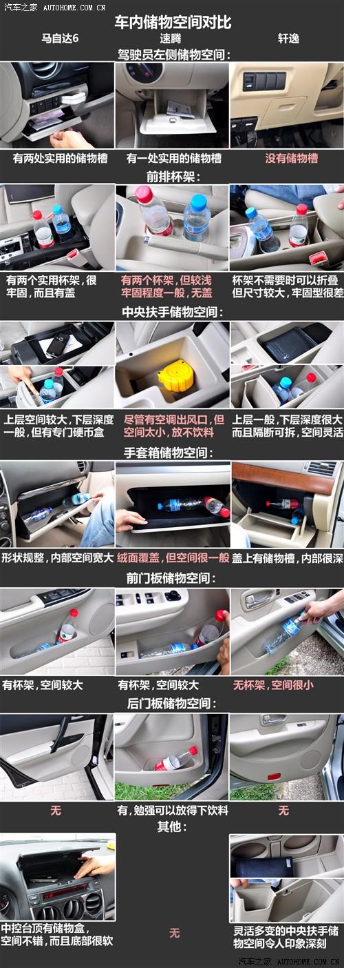 車內儲物空間對于車輛實用性的影響也很大,我們對于三款車用相同的道具、按照相同的標準進行衡量: