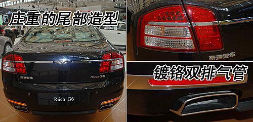 外觀上,瑞麒G6兼顧了流行元素同時刻意滿足國人的審美需求,以便在國內和國際市場達到雙贏的效果。加大的進氣格柵,引擎蓋上的頗顯豪華感的臥標,還有車身外側的鍍鉻裝飾條等等,均提升著這款車型的視覺豪華感覺。