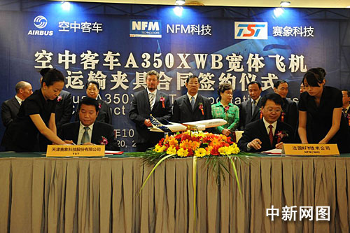 中新網天津10月20日電(郭曉帆)10月20日,空中客車公司與北方重工集團旗下的法國NFM科技公司,在天津簽署總額約3000萬美元的空客A350XWB寬體飛機專業運輸夾具設計與制造采購合同。根據合同,至2016年,北方重工集團控股的NFM科技公司將為空客公司最新推出的飛機項目——A350XWB寬體飛機分批設計和制造專業運輸大部件夾具80套,用于將分布在歐洲各工廠的A350XWB寬體飛機大部件,運送到法國圖盧茲的A350XWB飛機總裝線。