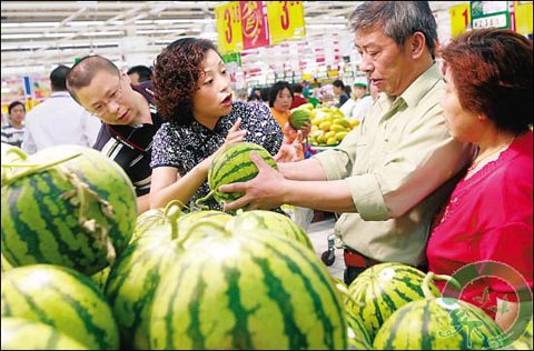 雖然今年的瓜小,但是也有一部分市民卻為此“偷著樂”,上海商報記者小王打趣地告訴本網,“今年的西瓜比往年,是真的小,大概一個正好夠一個人吃的,公平又健康,歡迎你來看世博會時好好品嘗。”(余曉芬)