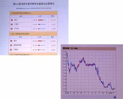2月5日,聯想宣布柳傳志重掌聯想的消息后,新浪網隨后對柳傳志復出進行了問卷調查。截至第二天上午九點就有兩萬余人參與調查,結果顯示:58.4%的網友看好柳傳志重新出任董事長,選擇不看好的只有24.8%,認為聯想因此能再創輝煌的網友達52.5%,市場層面也反應積極,聯想集團股票在2月6日大漲11%,而在今年以來,聯想股價已經下跌了33%。