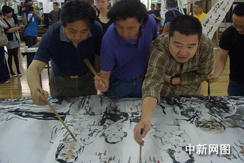 來自浙江畫院的池沙鴻等畫家共同完成向災區遇難同胞表達哀思的作品。