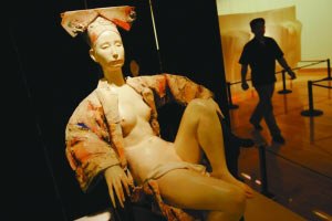 昨日,在第三屆中國(guó)北京國(guó)際美術(shù)雙年展上,一尊私處遮著白方巾的半裸慈禧雕塑,引起不少觀(guān)眾注意。雕塑作者李象群稱(chēng),該雕塑本無(wú)此“遮羞布”,是主辦方稱(chēng)有觀(guān)眾舉報(bào),才將雕塑私處遮蓋。