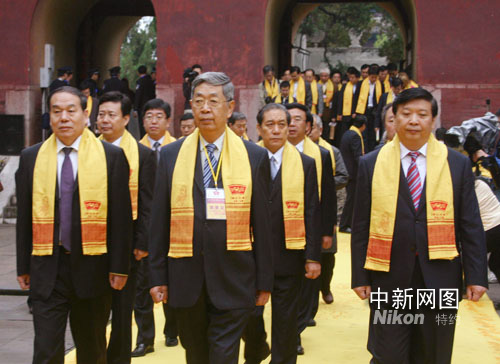 古磬敲響,身披黃色綬帶的朝圣者們莊嚴(yán)步入屬于先哲的歷史時空,在杏壇與大成殿間緩緩止步。抬首仰望,巍然聳立的孔廟大成殿正如至圣先師,于云霧之間俯視黎庶,巋然等待著后世眾人的朝拜。“繼往開來,永興此邦……”在山東省政協(xié)主席孫淑義的主持下,公祭大典開始。《天人合一》、《與時偕行》、《萬世師表》等樂章依次響徹孔廟,在身著明代祭服的舞者簇?fù)碇拢袊珖舜蟪N瘯蔽瘑T長許嘉璐、中國文化部副部長周和平、中共山東省委副書記、省長姜大明、聯(lián)合國教科文組織代表、孔子教育獎獲獎代表、著名書畫家范曾等朝圣者分別向先師孔子敬獻花籃。