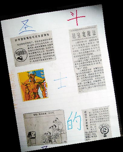 黃曉明被曝光的不是作文,而是初一時候的摘抄本,現在看來,這些摘抄本相當幼稚,封面上畫了朵很大的花,旁邊是黃大帥哥當年的稚氣簽名:“初一(1)黃曉明”。在摘抄本的內頁中,則是一些剪報和歌詞抄錄,其中的一頁剪報內容是生活小竅門《如何使松懈的毛衣恢復彈性》、《鐵鍋不宜做酸食》、《居室寬敞法》、另一頁是《蘿卜的妙用》等同類剪報,兩張剪報的空白處,都用彩筆寫著“圣斗士”“米老鼠園地”等字樣,還有一頁則是歌曲《世紀行》的歌詞抄錄,在下方是“太棒了”、“Very good”等評語。