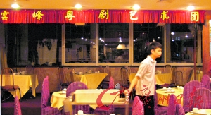 昨晚的榮華樓仍掛著云峰粵劇團的橫幅,因為白云峰逝世,這兩天停止了演出。劉雷攝
