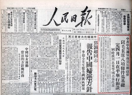 4月1日,由張治中、邵力子、黃紹竑、章士釗、李蒸、劉斐組成的南京國民黨政府談判代表團到達北平,周恩來等設宴招待。以周恩來為首席代表,林伯渠、林彪、葉劍英、李維漢、聶榮臻為成員的中共代表團,開始與國民黨代表團舉行和平談判。4月15日,形成八條二十四款的《國內和平協定》。但結果,南京政府拒絕接受協定,徹底暴露了假和平的真面目。