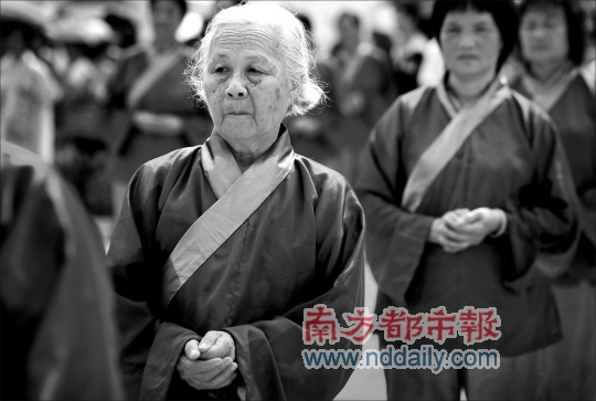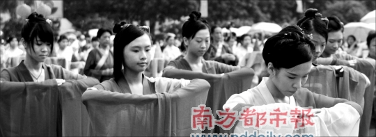 “每走一步、袖子怎么擺動,都有講究!睆V東省民俗文化研究會副秘書長、珠村民俗專家潘劍明是儀式主持,他透露,此次演出專門請來“漢禮”專家按歷史傳統還原場面。