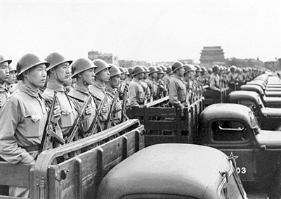 陸、海、空三軍佩戴統(tǒng)一制式的帽徽和胸章,著50式軍服受閱,整齊劃一,面貌一新。新中國成立后我軍第一次有了統(tǒng)一制式、統(tǒng)一標(biāo)準(zhǔn)的軍服。