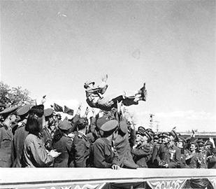 閱兵結束后,張百川跟同學們紛紛跑到照相館拍照留念。大家都穿著閱兵時的裝束:為閱兵專門配發的綠色飛行員帽子、上衣,白色襯衣,腳上穿著咖啡色的仿毛皮鞋。張百川介紹說,原本發的是普通的軍用膠鞋,為了踢正步時鏗鏘有力,特意發放了這樣的皮鞋,據說是抗日時繳獲日軍的。