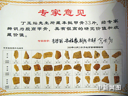 在本次論壇上,廈門當代置業(yè)集團副總裁、廈門復文美術館副館長、福建海泉蘭花實業(yè)有限公司董事長丁玉燦,將個人繼承、收藏的,經現(xiàn)場專家組“辨識為殷商甲骨,具有很高的研究價值和收藏價值”的三十三片甲骨,無償?shù)鼐栀浗o南靖縣人民政府永久收藏。
