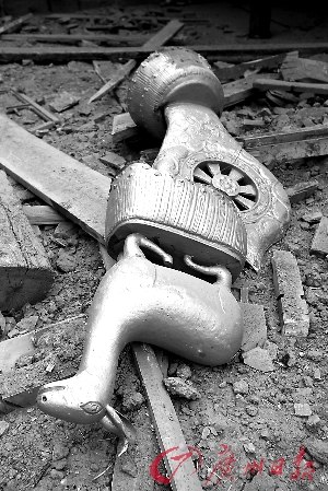 繼續前行,就是結古寺大經堂的背面,經堂的外墻大約有五六米高,絳紅色的墻體雖然沒有垮塌,但是裂縫蛛網般密布,其中有一處裂縫縱觀上下,長度有五米多,中間可以放進大約三個手指。如果說外立面的損壞還有望修補加固的話,從桑周加措大經堂的正門進去,只見大經堂的主殿徹底垮塌,主殿頂上豎立的金筒橫倒在了一邊,主殿的大門已經被封死,砸落的磚石和塵土已經將門窗全部遮蔽,無法看清楚里面的景象。在主殿一側的偏廳內,用來供奉佛像的數百盞酥油燈散落滿地。幾幅描述宗教故事的唐卡也蒙上了厚厚的灰塵。而在另一側的廚房內,幾百斤重的大鐵鍋也被震得變了形。