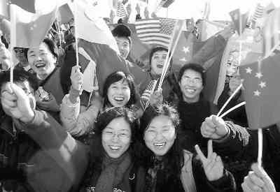 圖為北加州的中國(guó)留學(xué)生為奧運(yùn)圣火傳遞搖旗吶喊。