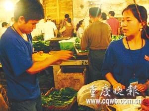 “愣在那兒干啥?吆喝幾句噻!”昨早7時30分,在模范村農(nóng)貿(mào)市場一菜攤,19歲的大一新生盛強(qiáng),拿著一捆小白菜,對身旁發(fā)呆的同學(xué)劉芳說。盯著眼前一堆蔬菜看了老半天的劉芳,終于吆喝起來。