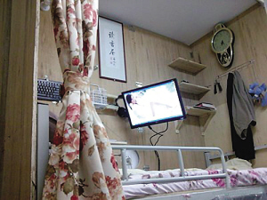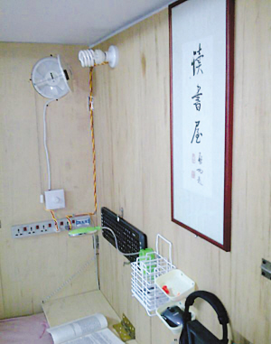 從論壇發布的照片上可以看到,三張木板及花色窗簾構造了一個豐富的私人空間(圖一)。內有照明、電腦及空氣循環設備,可伸縮的電腦屏幕和可隨時收合的寫字臺,鍵盤、鼠標和耳機掛在墻上(圖二),使用的時候只要旋動一個旋鈕,東西就可以拿下來在任何地點使用。這個狹小的空間內還有三層木架,可放生活用品(圖三)。最吸引人注目的是該男生還在床頭掛了一幅墨寶——“讀書屋”。給人的總體感覺是,這是一個富有創意又勤奮好學的學生。