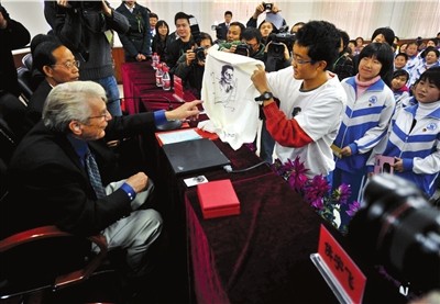 昨天(11月11日,下同)上午,2008諾貝爾獎獲得者北京論壇在人民大會堂開幕,7位諾貝爾獎獲得者和4位圖靈獎獲得者來京論道。當天下午,兩位諾獎得主分別前往三帆中學和北京理工大學,和大中學生們面對面交流。三帆中學每個班級都提前制作了立志信物贈送給大師。