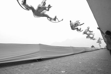 昨天,記者驅(qū)車趕到登封。雖然剛集訓(xùn)完,在塔溝武校的訓(xùn)練場(chǎng)上,220名學(xué)員仍馬不停蹄地訓(xùn)練。在一面寬50米、長(zhǎng)60米的巨幅國旗下,“彈跳小子”們身輕如燕,姿勢(shì)優(yōu)美(如圖)。