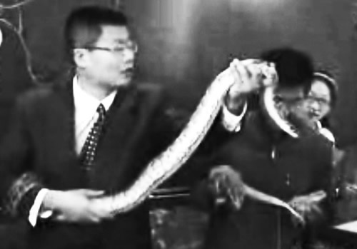 將一條長達2米多、重達5公斤的蟒蛇抱到課堂上當“模特”,教學生學習動物寫生的技巧。武漢市第五十九中教師鄒華章抱蟒蛇上課的視頻,近日在網絡上瘋傳。從10月27日上網到昨日,共有400多個網站轉載這一視頻,其中在一家網站的點擊率已高達12.6萬人次。
