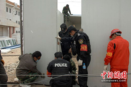 當(dāng)天下午,由成都公安特警30名青年民警組成的突擊隊(duì)與建材集團(tuán)員工一起先用挖土機(jī)將地面推平,然后隊(duì)員們分工合作、用帶來的發(fā)電機(jī)迅速發(fā)電,有的切割泡沫板,有的在鋼板上鉆孔,有的拼接泡沫墻面,在“5.12”抗震救災(zāi)時(shí)掌握的“施工技術(shù)”在這兒全用上了。這時(shí)的天空又一次飄起了雨夾雪,寒氣襲人,但特警隊(duì)員們?nèi)匀桓蓜攀。由于高原缺氧,一名?duì)員在劇烈搬送后出現(xiàn)了頭暈癥狀,其他隊(duì)員馬上將他扶到一旁休息,另一名隊(duì)員立即替補(bǔ)上去,他們就這樣輪番著作戰(zhàn)。在拼接板墻的時(shí)候,由于風(fēng)沙很大,隊(duì)員們眼睛、嘴里全是沙,但他們顧不了那么多,心中只有一個(gè)信念:就是以最快速度將板房建好,讓災(zāi)區(qū)的同學(xué)們早日復(fù)課,參加學(xué)習(xí)。