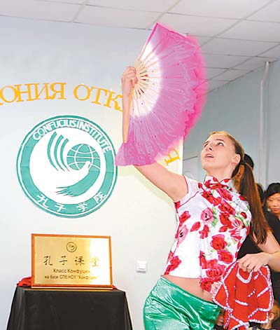 俄羅斯圣彼得堡孔子課堂的學生在表演中國扇舞。記者 王斌來攝